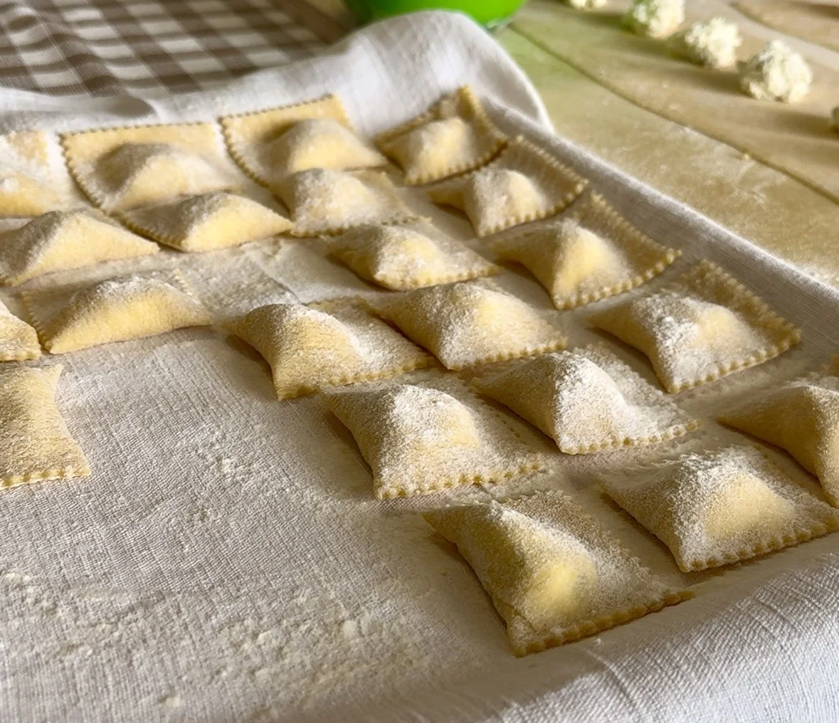 Seal and press the ravioli around the edge of the filling to avoid air pockets that could burst during the cooking. Cut the ravioli as shown in the video with a pastry wheel or a knife and place them lightly floured on a tray.